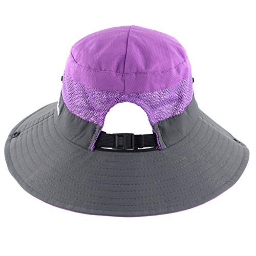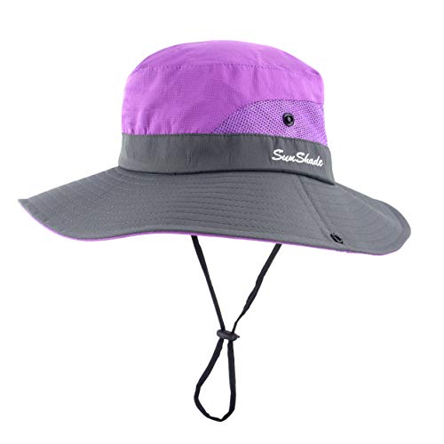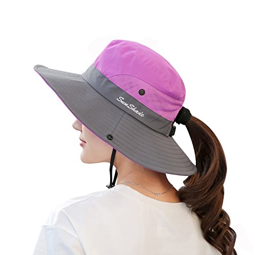 FUNCTIONAL AND VERSATILE: The brim is large enough to shade forehead. Inside of sun hat is a breathable mesh layer, which can greatly improve cooling, comfortable and airflow. Especially, a ponytail opening in back is considerate design for women. The buttons on both sides of bucket hat can give you more different styles.