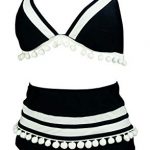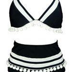 COCOSHIP Women’s Mesh Striped High Waist Bikini Set Tassel Trim Top Halter Straps Swimsuit(FBA)