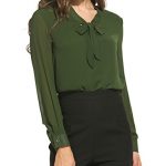 【Feature】:Vintage bow tie stand collar, long sleeve, pullover style, solid pattern, chiffon fabric, loose fit, casual work blouse