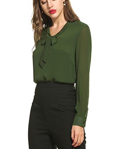 【Feature】:Vintage bow tie stand collar, long sleeve, pullover style, solid pattern, chiffon fabric, loose fit, casual work blouse