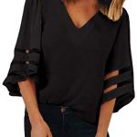 Feature: 3/4 Bell Sleeve, V Neck, Sheer Patchwork detail, Loose Fit Solid Color design