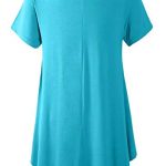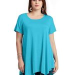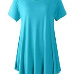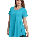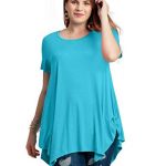 Figure flattering swing style short sleeve scoop neck top with handkerchief hemline.
