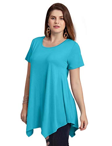 Figure flattering swing style short sleeve scoop neck top with handkerchief hemline.